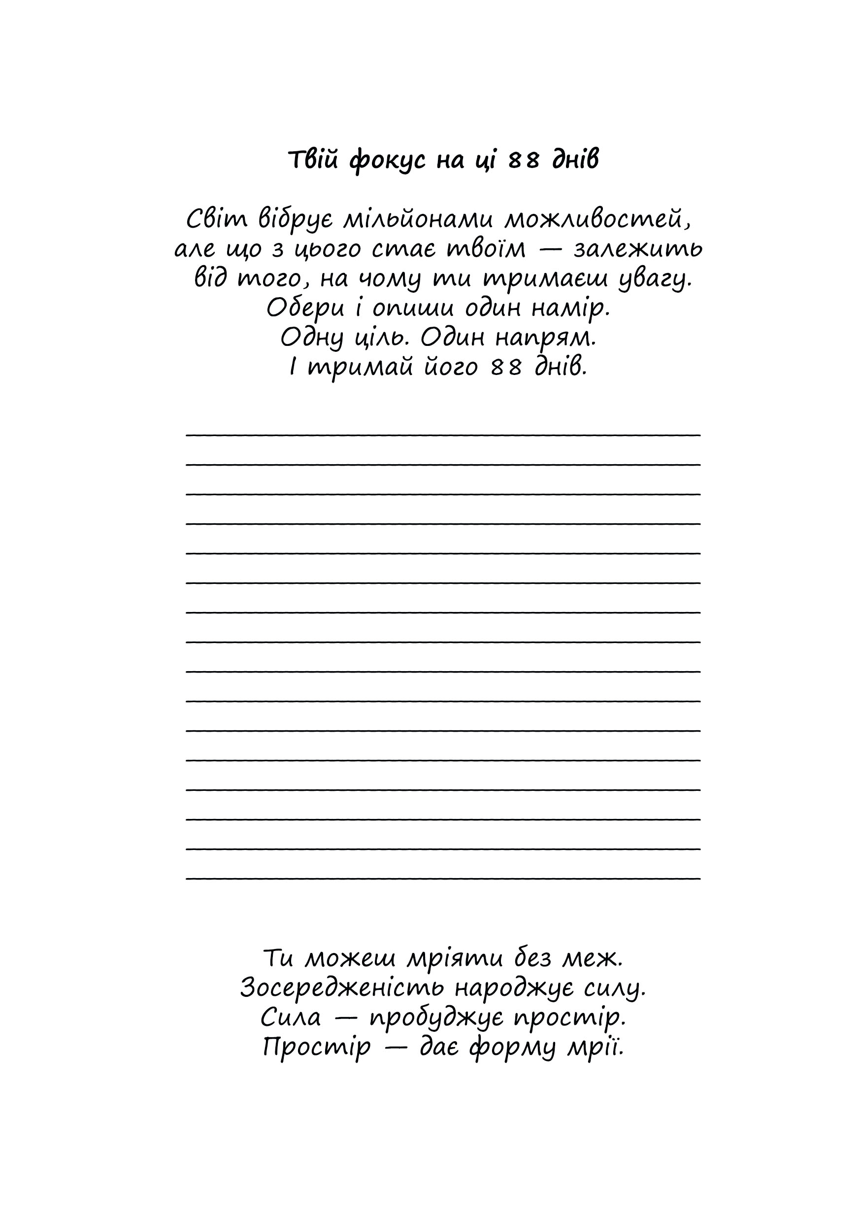 Ці 88 днів — простір, у якому ви можете працювати з особистим запитом або рухатись до конкретної мети, крок за кроком наближаючись до її реалізації.